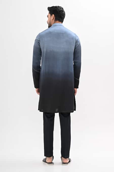 A grey to black shaded kurta crafted from fine linen satin fabric, featuring a band collar and full sleeves. It has an attached mulmul lining. The kurta is paired with tailored black pant pajamas that have a half belt, half elastic waistband, two pockets, and a zipper and button closure.