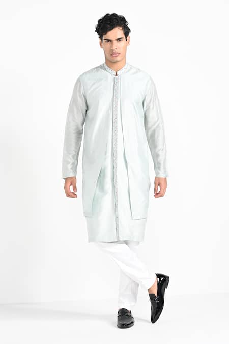 This ice blue kurta is crafted from Bamberg raw silk with a full lining and features hand embroidery. It is paired with ivory malai cotton pant pajama, which has a half belt, half elastic waistband, two pockets, and a zipper and button closure.