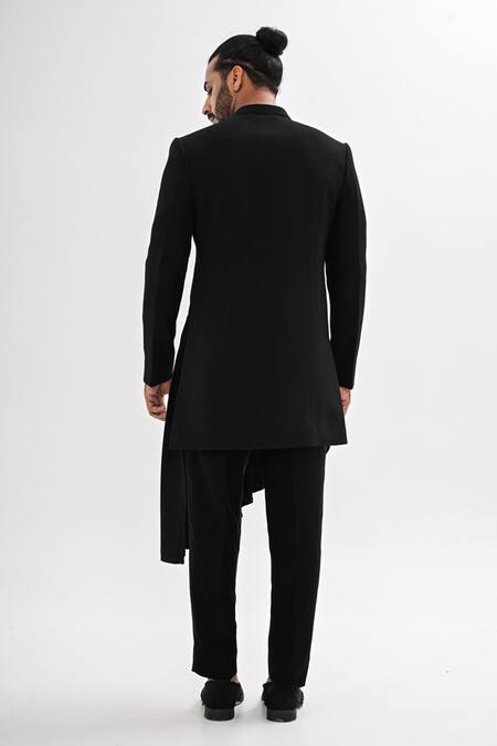 A black Achkan crafted from fine textured terry rayon fabric, featuring hand embroidery and a draped detail. It is paired with tailored trousers that have a full belt with belt loops, front pockets, and a zipper with a metal hook and concealed button closure.