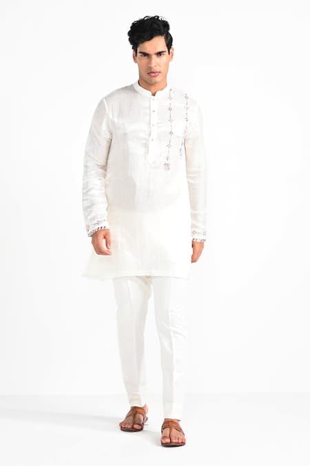 Buy_Kalpana Naik_Ivory Linen, Satin, Cotton Embroidery Hand Kurta Set _Online_at_Aza_Fashions