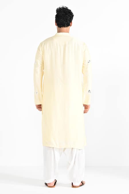 A lemon yellow kurta crafted from Bamberg raw silk, featuring hand and machine embroidery details and an attached lining. It is paired with a white salwar made from Bamberg raw silk, designed with a full elastic belt and no pockets.