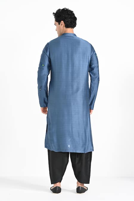 A merlin blue kurta crafted from Bamberg raw silk, featuring hand embroidery details and an attached lining. It is paired with a black salwar made from Bemberg raw silk, designed with a full elastic belt and no pockets.