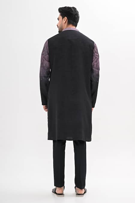 A purple to black shaded kurta crafted from Bamberg raw silk fabric, featuring hand embroidery and an attached mulmul lining. It is paired with tailored pant pajamas that have a half belt, half elastic waist, two pockets, and a zipper and button closure.
