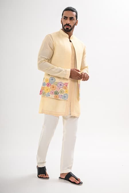A beige Nehru kurta crafted from Bamberg raw silk fabric, featuring hand and machine embroidery details. It is paired with tailored pant pajamas and a coordinating Nehru jacket adorned with colorful floral embroidery.