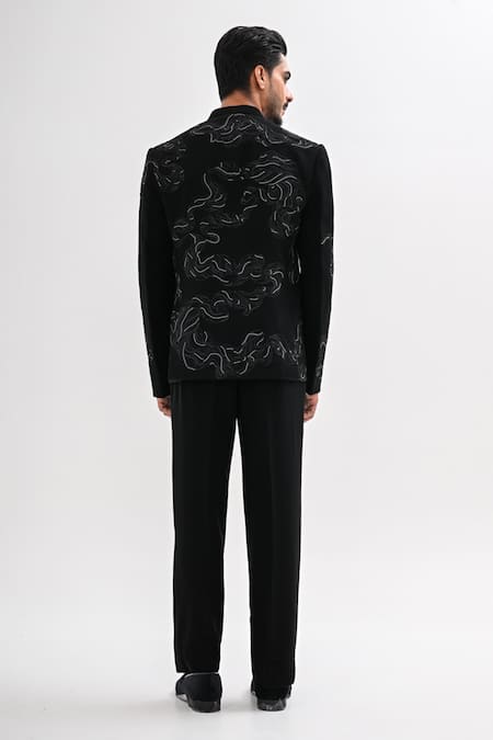 A black bandhgala crafted from banana crepe fabric, featuring abstract hand embroidery with a full attached lining. It is paired with coordinating black trousers, which include a full belt with belt loops, front pockets, and a zipper, metal hook, and concealed button closure.