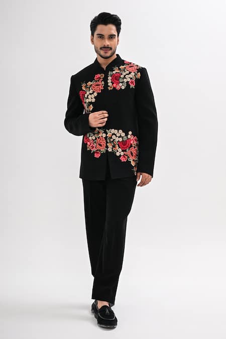 A black bandhgala crafted from fine banana crepe fabric, featuring intricate hand and machine embroidery with floral motifs. It is paired with tailored black trousers, which have a full belt with belt loops, front pockets, and a zipper and metal hook closure with a concealed button.