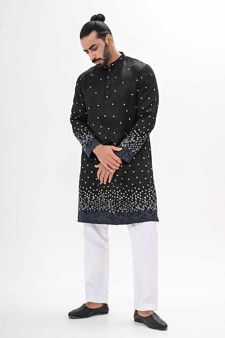 Black Linen, Satin Embroidery Ombre Onyx Hand Kurta Set