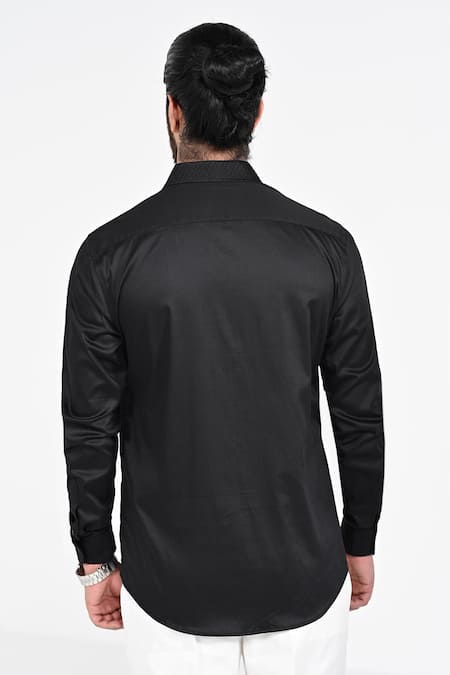 A black Giza cotton shirt featuring pintuck detailing on the left side of the collar and a cotton stretch base fabric.