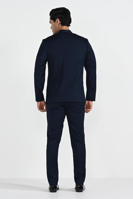 Onyx blue bandhgala featuring pintuck detailing and hand embroidery highlighted with cutdana. Paired with onyx blue slim fit trousers.