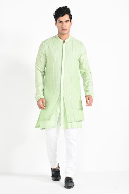 A pistachio green Bamberg raw silk kurta featuring hand embroidery and an attached lining. Paired with ivory Malai cotton pant pajama with a half belt, half elasticated waist, two pockets, zipper, and button closure.