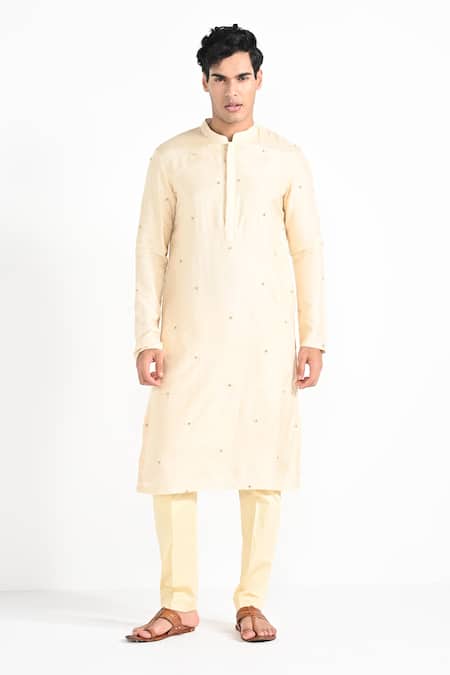 A buttercream cream Kurta crafted from Bamberg Raw Silk with an attached lining, featuring hand embroidery. It is paired with buttercream Malai Cotton Pant Pajama with a half belt, half elastic waist, two pockets, and a zipper and button closure.