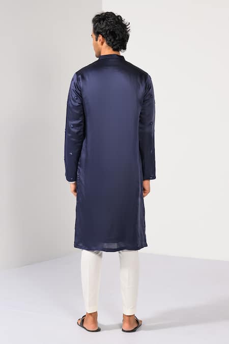 A sapphire blue linen satin kurta with an attached lining features big butta with thread and pipe hand embroidery. It is paired with a slim fit malai cotton pant pajama with a half belt, half elastic waist, two pockets, zipper, and button closure.