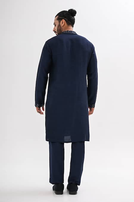 A navy blue kurta crafted from Bamberg raw silk, featuring mirror-work hand and machine embroidery on the band collar and cuffs. It is paired with coordinating pant pajamas and a mirror-embroidered Nehru jacket.