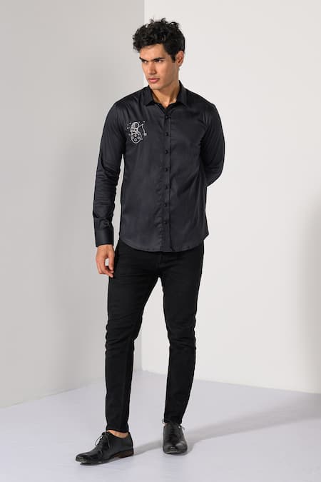 A black Giza cotton and cotton stretch shirt features hand embroidery with white thread work, depicting an astronaut on a moon with stars.