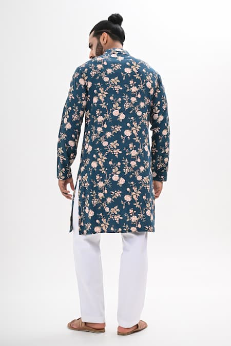 A teal blue kurta crafted from crepe fabric, featuring an all-over floral print with hand and machine embroidery. It is paired with tailored white pant pajamas that have a half belt, half elastic waistband, two pockets, and a zipper and button closure.