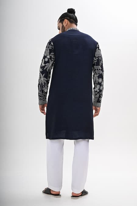 A navy blue kurta crafted from fine Bamberg raw silk, featuring intricate hand and machine embroidery with a mulmul lining. It is paired with tailored pant pajamas that have a half belt, half elasticated waistband, two pockets, and a zipper and button closure.
