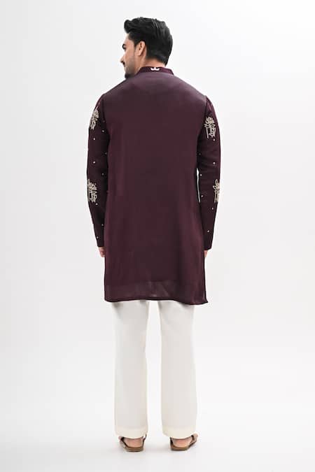 A wine kurta crafted from linen satin fabric, featuring hand and machine embroidery. It is paired with tailored pant pajamas that have a half belt, half elastic waistband, two pockets, and zipper and button closure.