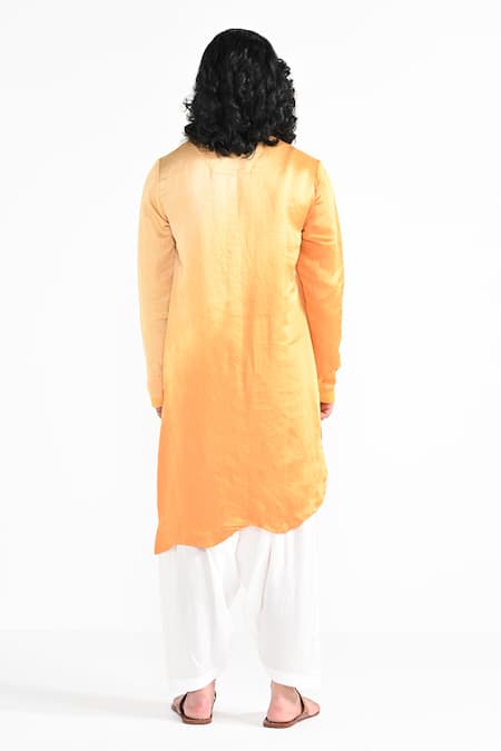 This sunset yellow ombre kurta is crafted from linen satin fabric and features hand embroidery details. It is paired with a white salwar made from Bamberg raw silk, featuring a full elastic belt and no pockets.