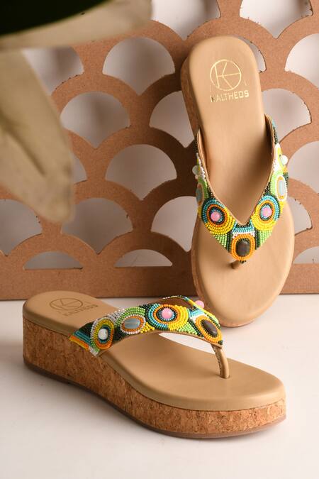 Beige wedges featuring multicolor stone and bead embellishment on the strap with split toe detailing