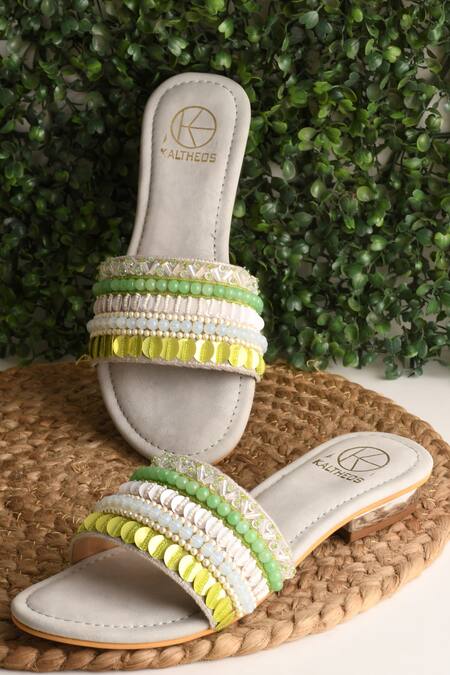Stone and bead embellishments on the strap, Cutdana detailing, Round toe design