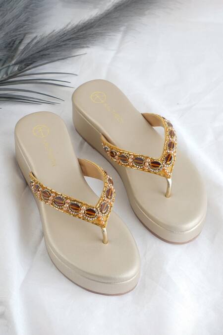 Gold wedges featuring glass stone embellishments on the strap and split toe detailing