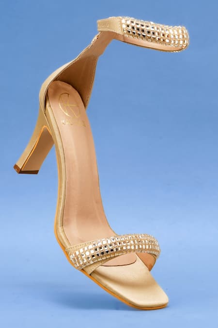 Gold heels featuring silver Swarovski embellishment on the strap and a square front