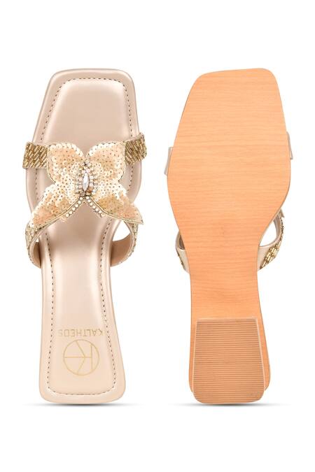Gold embellished block heel sandals featuring a butterfly motif on the upper strap