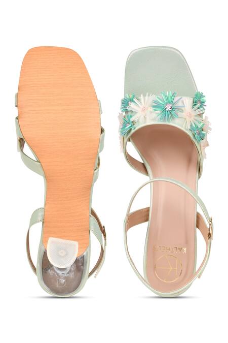 Green heels featuring multicolored floral embellishments and a square front toe