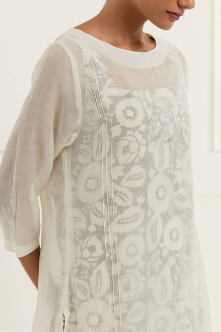 Off White Chanderi, Muslin Embroidery Boat Blossom Motif Pittan Kurta Pant Set