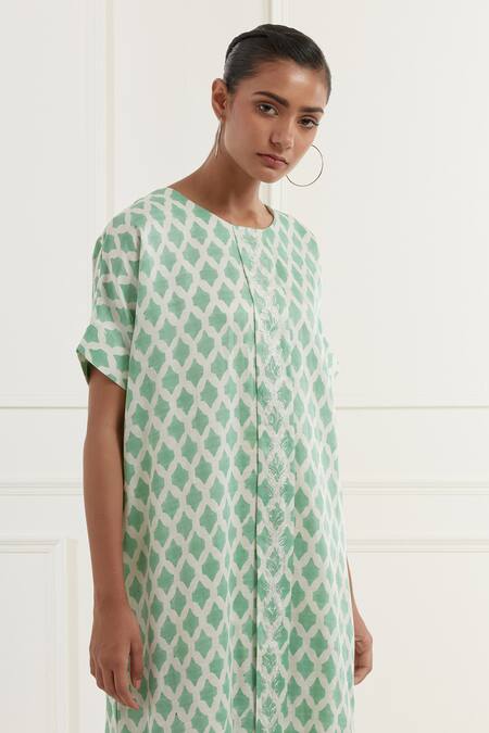 Green Linen, Satin Embroidery, Piping Geometric Block Print Kurta With Pant