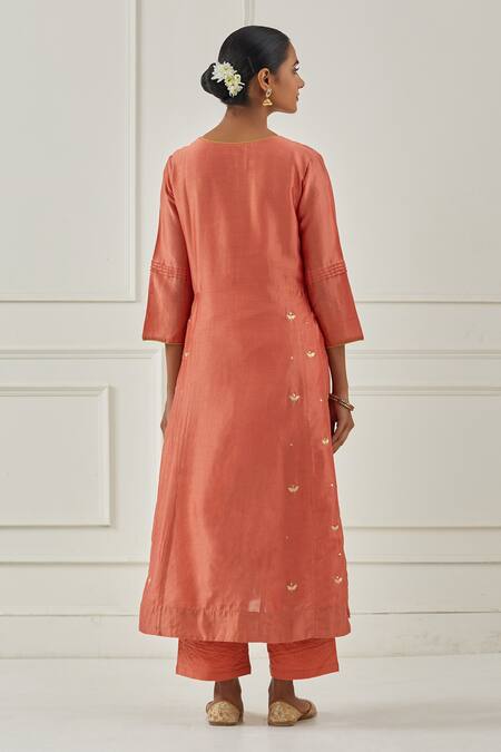 Rust orange chanderi silk anarkali featuring front buttons, side kalis, and dull gold pittan hand embroidery. Paired with cotton lurex straight pant and attached mulmul lining.