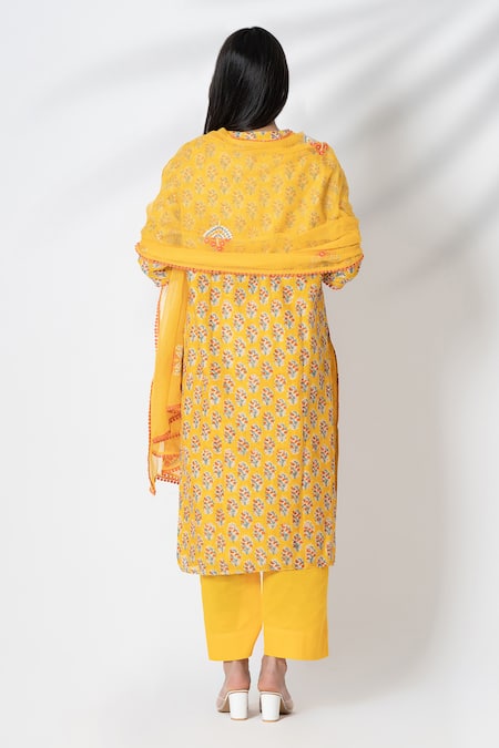 Golden yellow kurta featuring all-over floral hand block prints with a V neckline and three-quarter sleeves. Paired with a matching pant and a dupatta adorned with contrast lace border and butti embroidery.