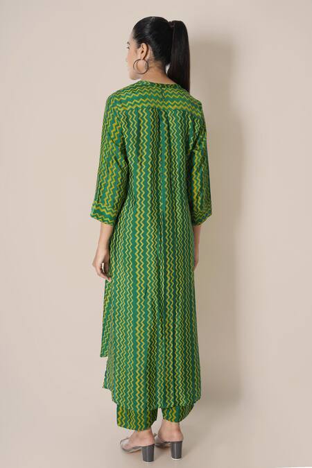 Green kurta with chevron print & mandarin collar. Paired with printed pant.