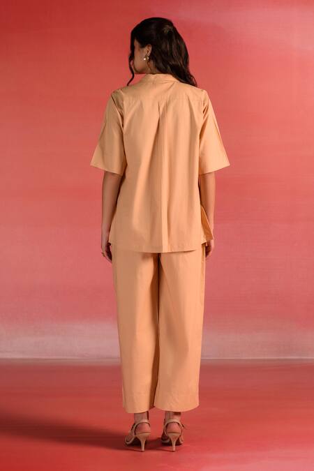 Peach shirt featuring a collar and half sleeves with floral patchwork embroidery along the hem. Paired with straight-fit pants for a coordinated look.