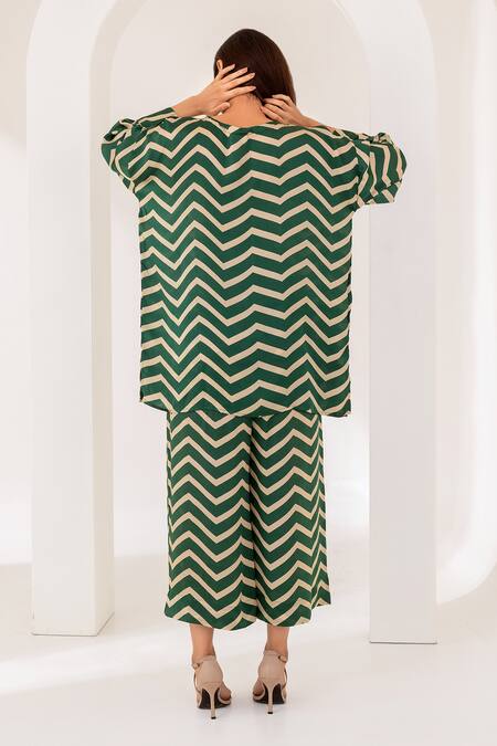 Cream and green kurta featuring drop shoulder sleeves and a boat neckline. Paired with wide-legged printed pants showcasing a chevron stripe pattern.