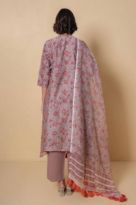 Lavender purple printed kurta featuring floral motifs and a button placket. Paired with matching pants and a lightweight dupatta adorned with tassels.