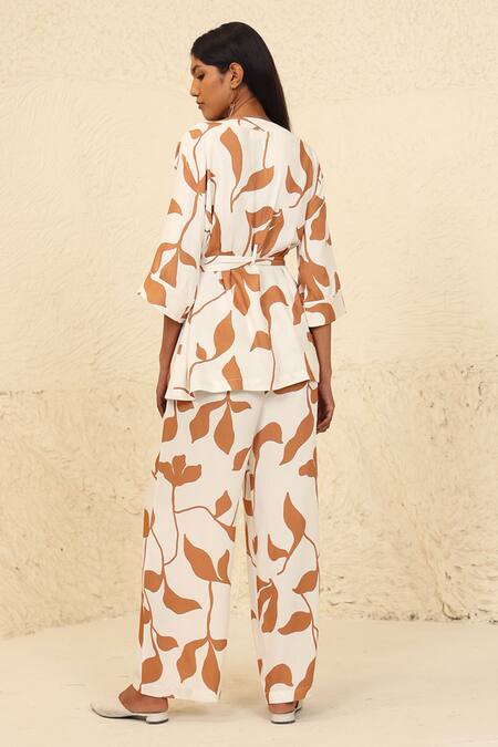 Beige and white floral printed wrap top featuring a V neck and three quarter sleeves. Paired with straight fit trousers with an elasticated waistband and side pockets.