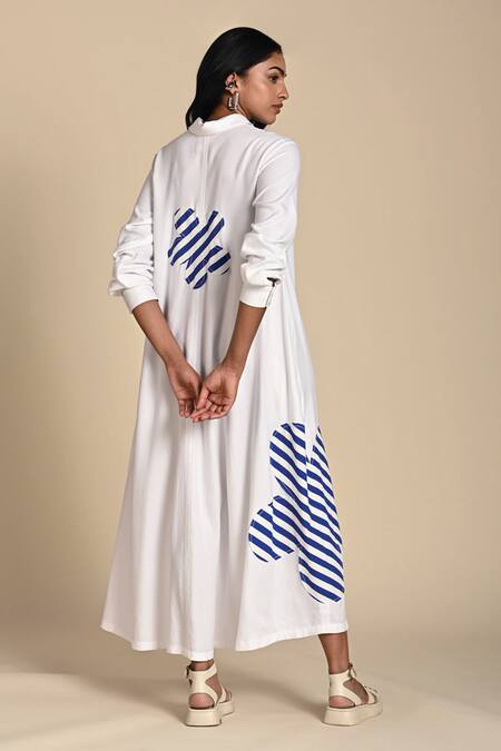 White midi shirt dress featuring contrasting blue striped bloom patch embroidery and side inseam pockets