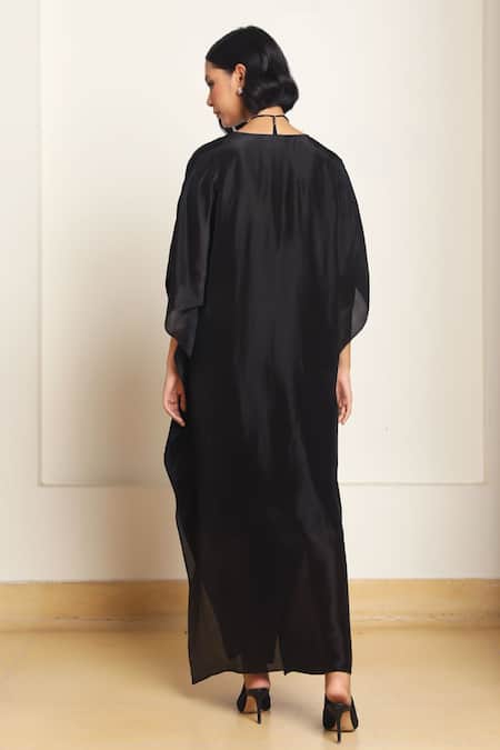 Black kaftan featuring drape detailing and drop shoulder design. Comes with an inner slip for added comfort.