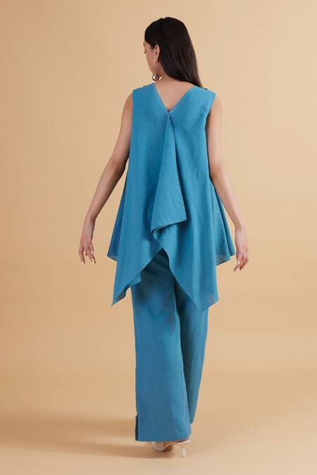 Blue Cotton, Linen Round Neck Multi-panel Draped Top And Pant Set