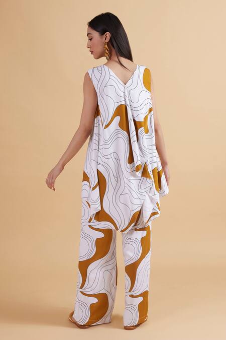 Ivory and honey yellow multi-panel printed top featuring drape detail at the back. Paired with a matching straight-fit printed pant with side opening and elastic closure.