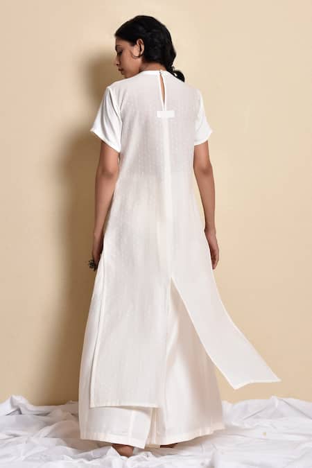 White Doby Pant , Kurta Band Collar Embroidered Palazzo Set