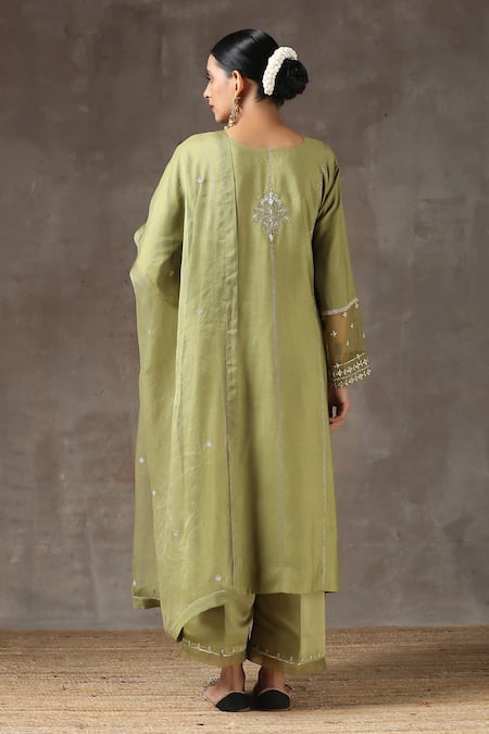 Mehendi kurta with floral embroidered motifs & organza paneled border, sleeves. Paired with palazzo & dupatta.