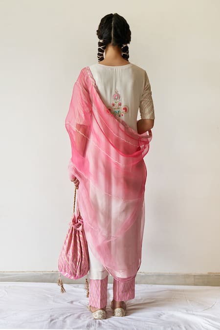 White kurta highlighted with intricate floral resham embroidery, round neckline, elbow sleeves and straight silhouette. Comes with fuchsia pink leheriya pant and shaded dupatta.