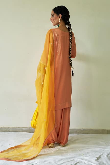 Peach kurta featuring dabka-pitta hand embroidery, round neckline, and full sleeves. Paired with a peshwa salwar and embroidered yellow organza dupatta with contrast border.