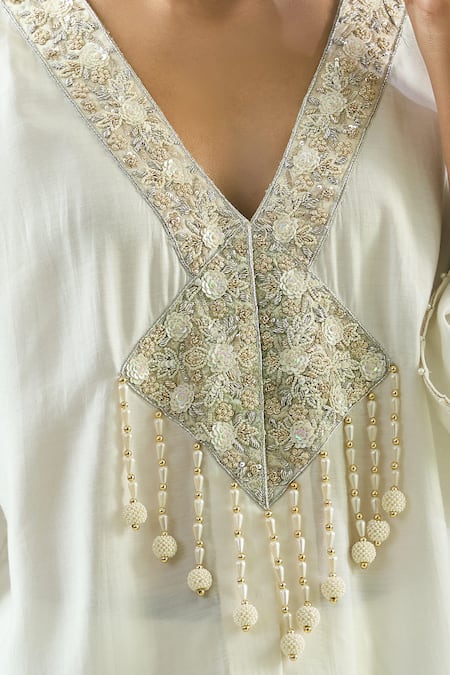 White asymmetric kurta featuring thread, crystal tassels and beads embroidered floral motifs on the yoke. Paired with coordinating solid hem embroidered dhoti pant.