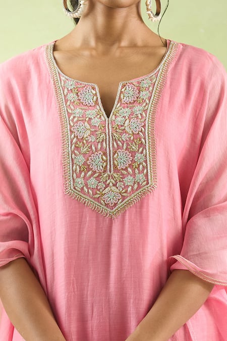 Pink Chanderi Silk, Crepe Beads, Floral Embroidered Kaftan And Dhoti Pant Set