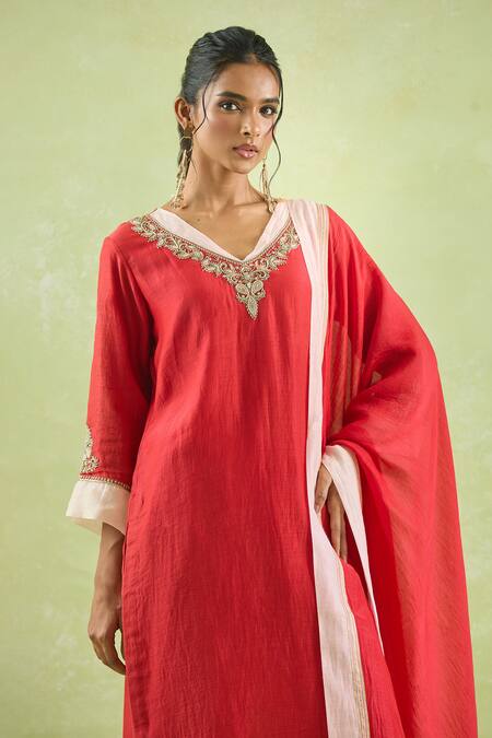 Red kurta featuring a V-neckline with floral embroidery, beads, and stones. Paired with coordinating embroidered pant and dupatta.