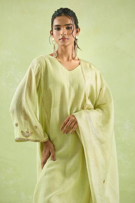 Green kurta featuring floral gota embroidery on sleeves and pintuck embroidered yoke. Paired with coordinating solid pant and embroidered dupatta.