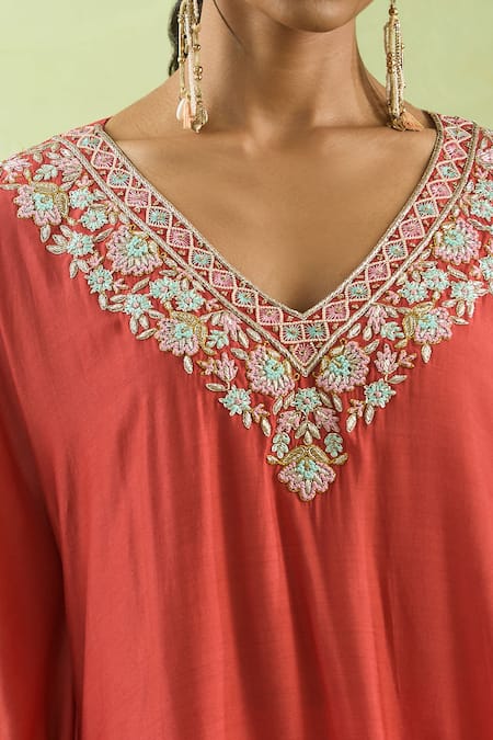 Red Modal Beads, Stones, Embroidery V-neck Floral Kaftan With Palazzo